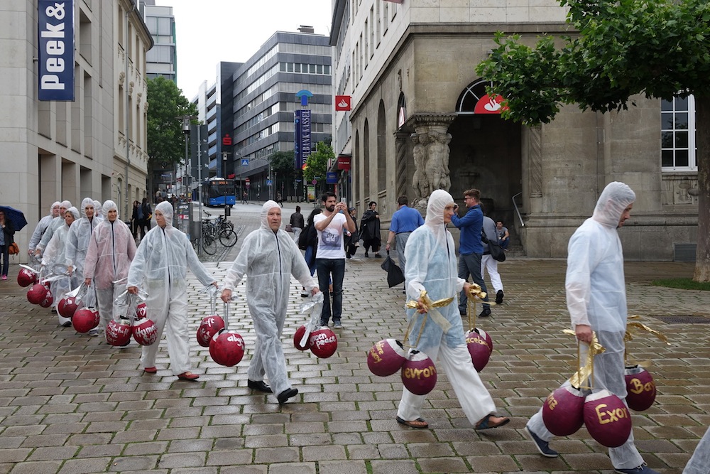 - dass alle ballons, paarweise gehalten von zwischen den düsen stehenden performern,