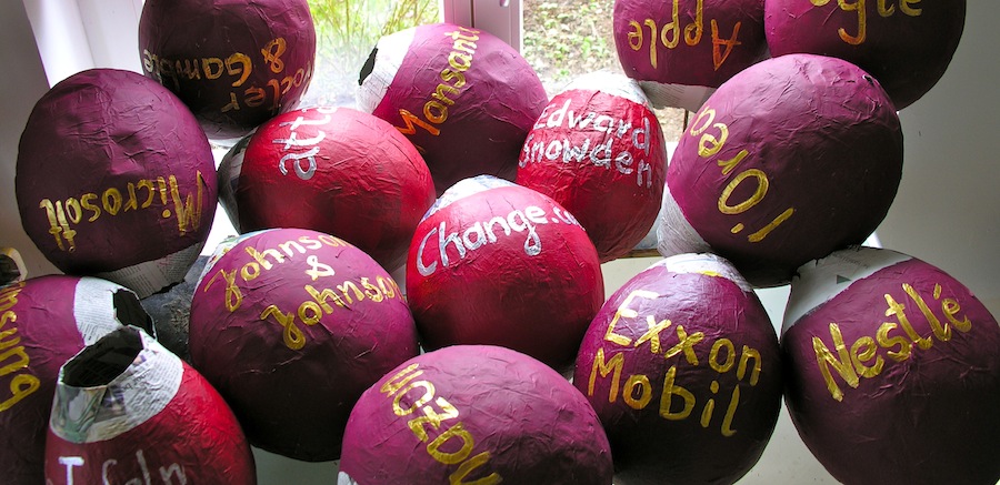 - auf der einen hälfte der insgesamt 72 fragilen ballons (paarweise gehängt –hodenanalog) stehen 32 namen aus der liste der 100 weltweit marktführenden, also der mächtigsten und finanzkräftigsten weltkonzerne