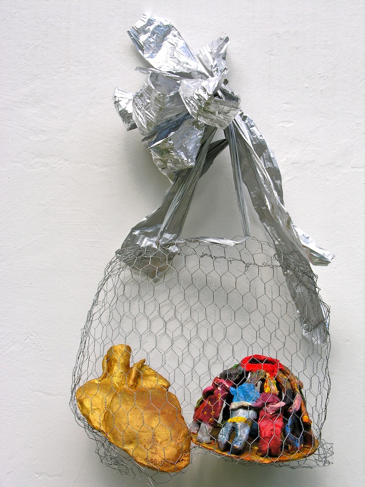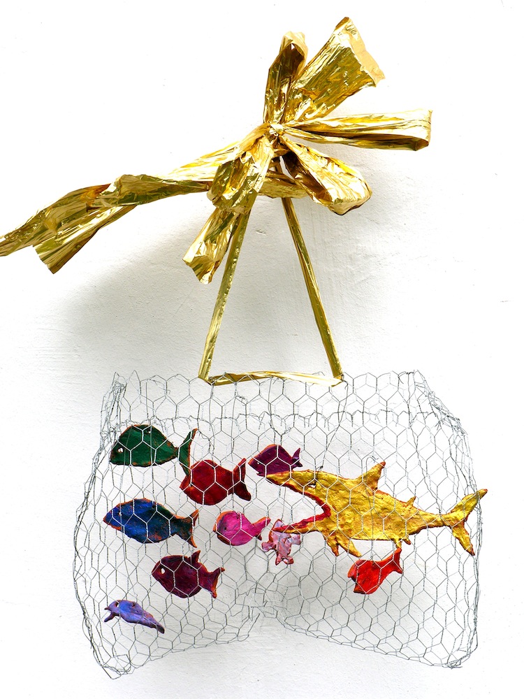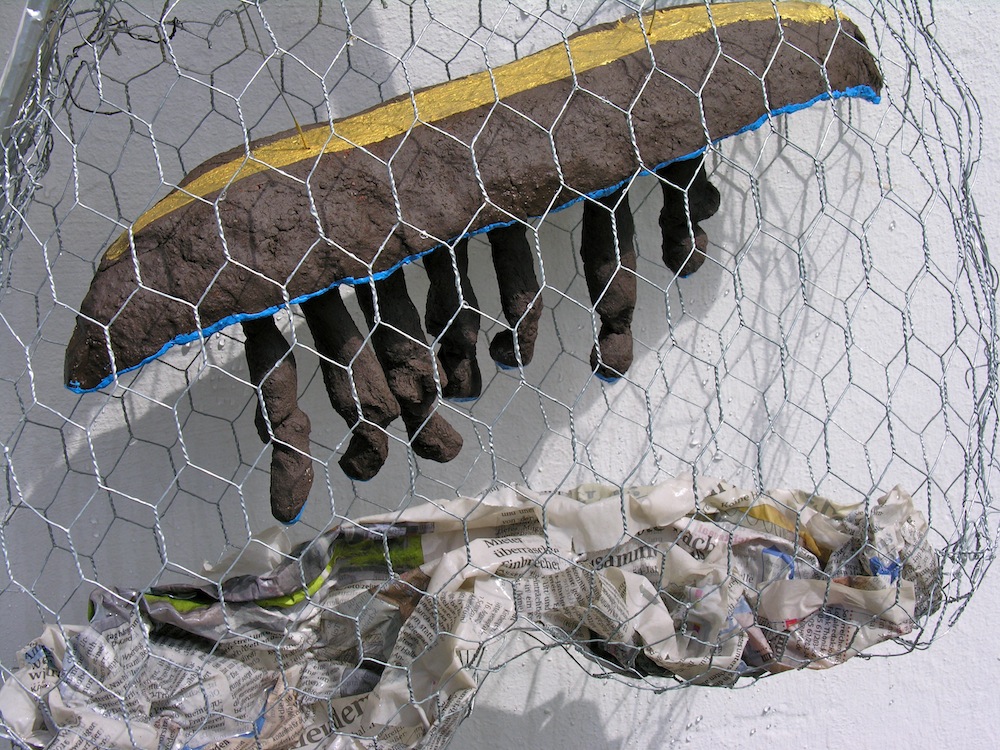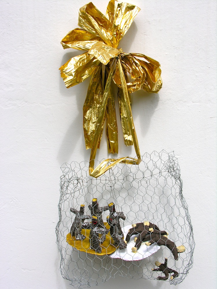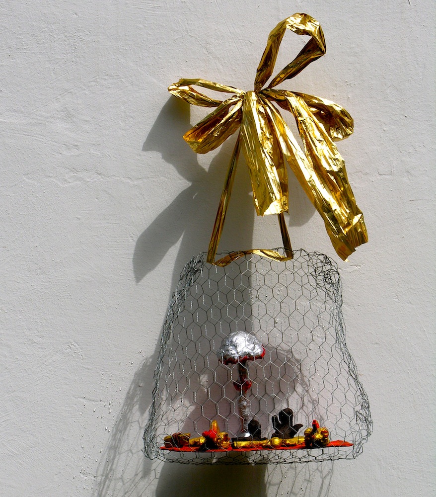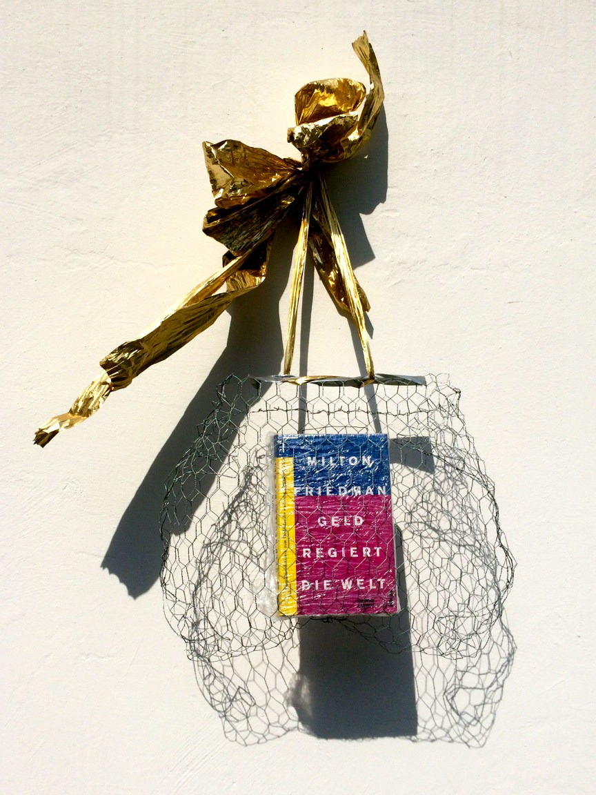 - die schleifen und bänder der aufhängung (der „schöne schein“) sind geeignet, den betrachter reflexartig zunächst zu täuschen, die installation für etwas dekoratives zu halten; ihn in seiner konsumentenseele anzusprechen