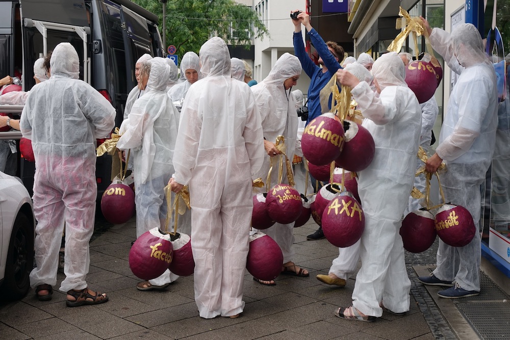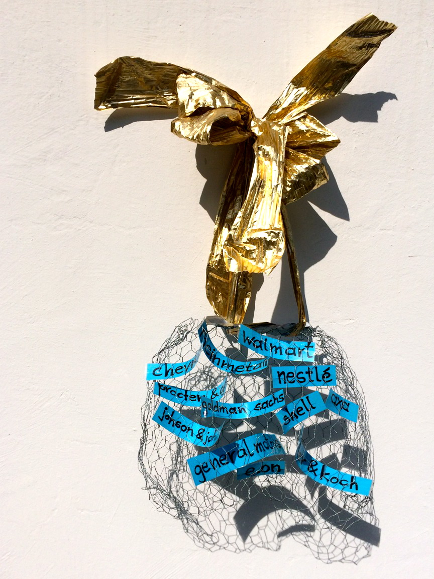 - auf der einen hälfte der insgesamt 72 fragilen ballons (paarweise gehängt –hodenanalog) stehen 32 namen aus der liste der 100 weltweit marktführenden, also der mächtigsten und finanzkräftigsten weltkonzerne