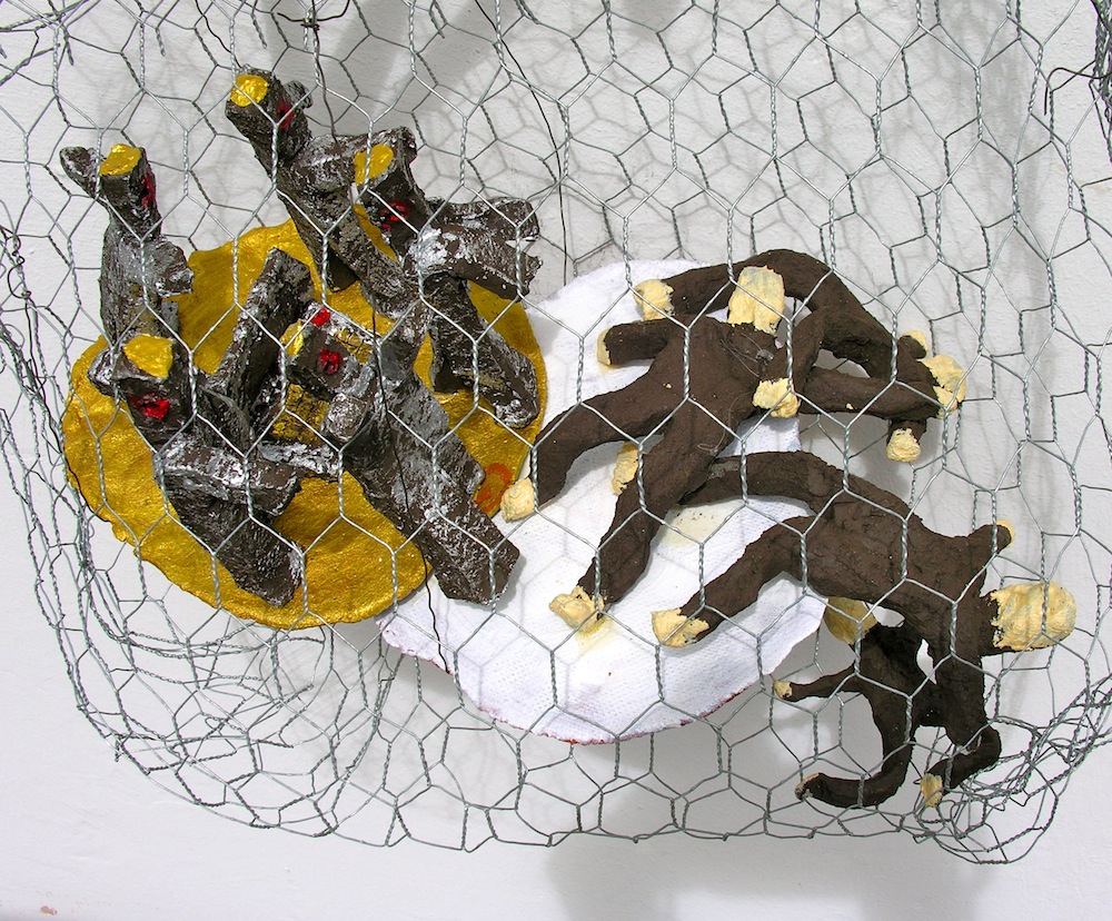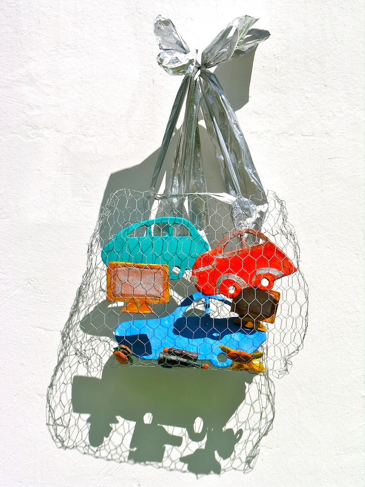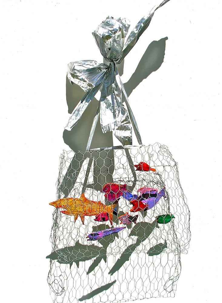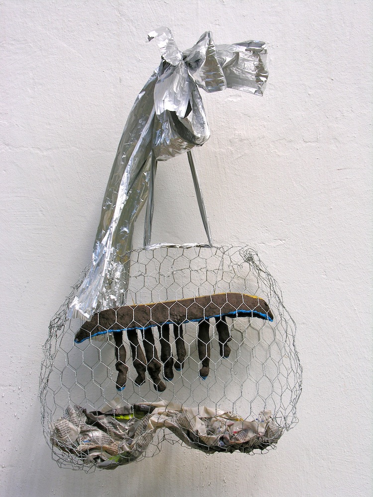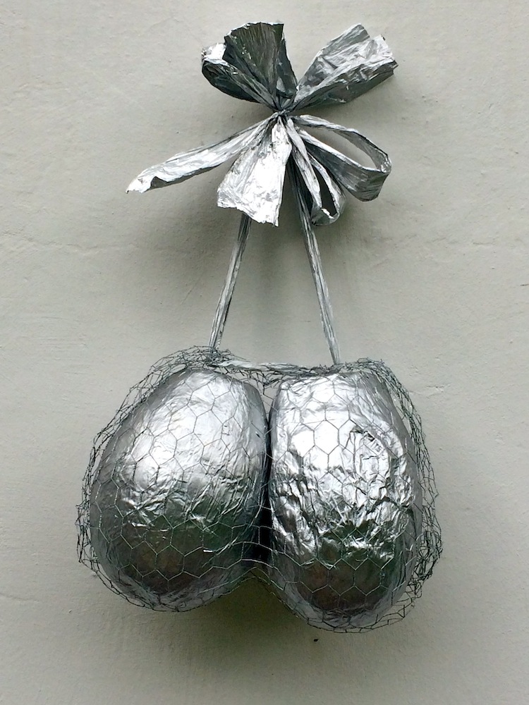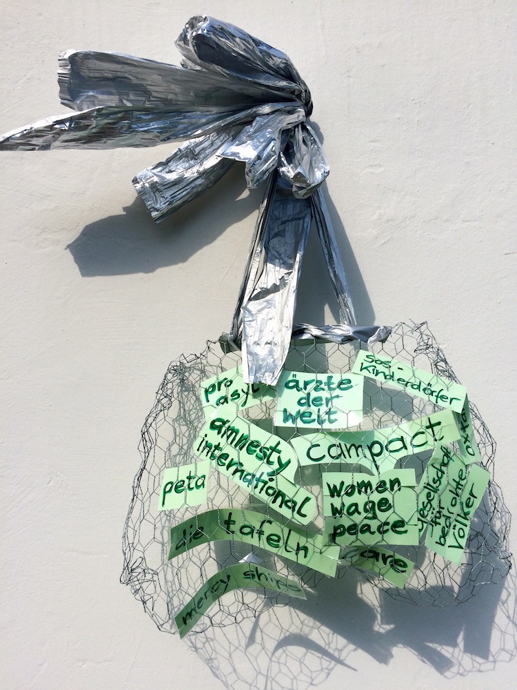 - die schleifen und bänder der aufhängung (der „schöne schein“) sind geeignet, den betrachter reflexartig zunächst zu täuschen, die installation für etwas dekoratives zu halten; ihn in seiner konsumentenseele anzusprechen
